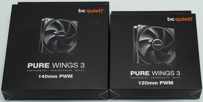 For our tests, we received the 140mm PWM and the 120mm PWM Pure Wings 3 fans. The retail package is simple and includes the fan and four screws. The design of both packages is the same.