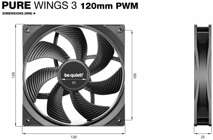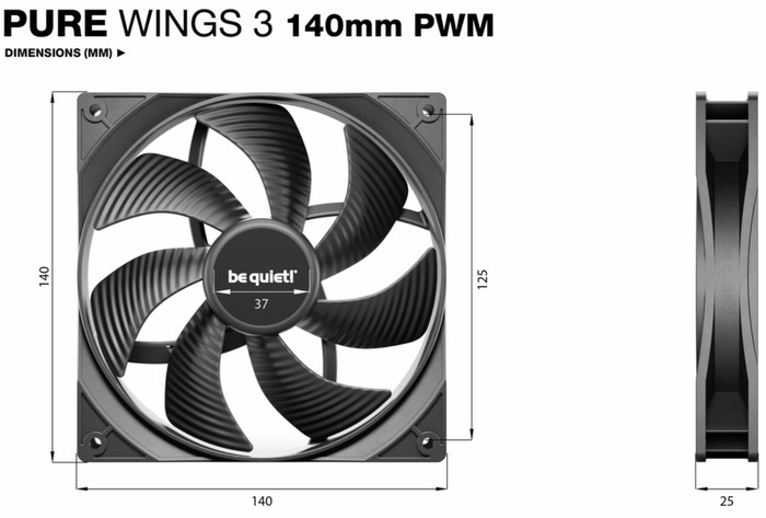 The 140mm PWM Pure Wings 3 fan, comes at a standard 140x140x25mm size, which is industry standard after all.