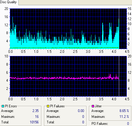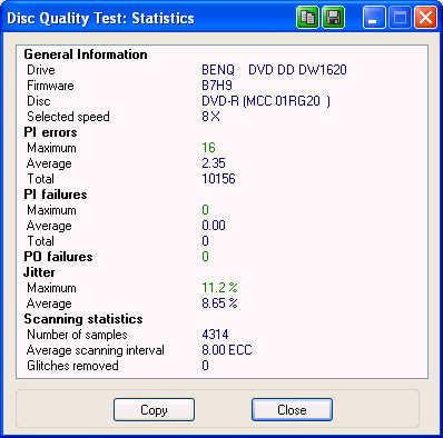 The BenQ DW1620A can report PI and Jitter values from burned DVD recordable/re-writable media. What's rather disappointing is that the drive cannot read the media at high speeds, since even at 8X reading speed, the real speed is around 0.5~1.3X. The scanning interval also is not 1ECC but 8ECC, dropping the accuracy of the drive, since the sample count is low.