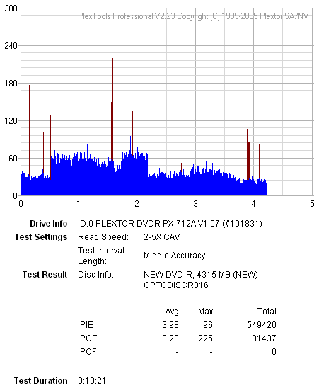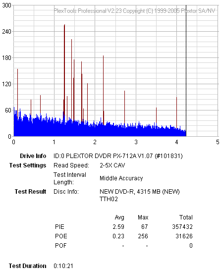 In general, a "perfect" disc should have a smooth reading curve, very low PIE/POE and zero (0) POF error rates. Most times however, even though a disc has very low PIE/POE error rates, the reading curve may not be smooth containing dropoffs. Due to the fact that we overspeed the reading capabilities of the LiteON SOHD-167T, such drops are expected, especially near the outer area of the disc.