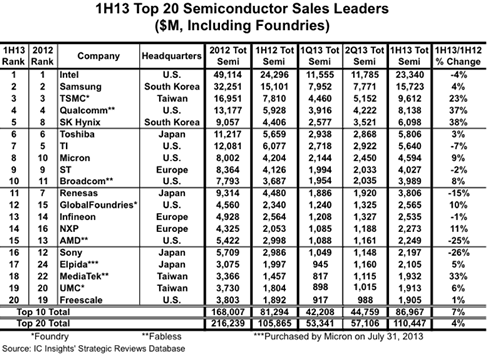Big Changes Reported To 1H13 Top 20 Semiconductor Supplier Ranking