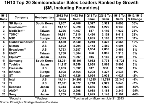 SK Hynix, Broadcom, Elpida, and MediaTek jumped up positions within the top-20 semiconductor ranking in 1H13, while Intel, TSMC and Samsung maintained their top positions.