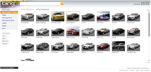 A search at bing.com/visualsearch for "cars," for example, returns a gallery of thumbnail pictures of cars which can then be filtered by manufacturer or by price, displaying a new set of images.