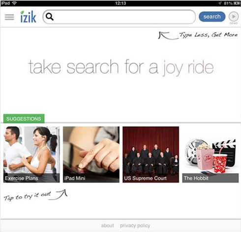 "Our goal with izik was to move the task-oriented search product we all use on our computers (aka 10 blue links) and turn it into a more fun, tablet-appropriate product. That means an image-rich layout with an appearance and experience very different than what we?re used to seeing on a laptop," Blekko wrote in a blog post.