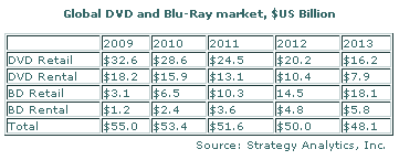 The total packaged media market, including both retail and rental of DVDs and Blu-Ray, is projected to decline 3% in 2010, to $53.3 billion and by 12.6%, to $48.1 billion by 2013.