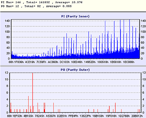 The following screenshots show the PI/PO scans for the various DVD-/+R and DVD-/+RW media, recorded with BTC DRW1008IM at the maximum permitted speed.