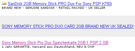 There are several packages of PSP, the base pack, the giga pack and the value pack, with different bulked games and accessories. We would suggest buying the base pack and grab an at least a 2GB Memory Stick Duo Pro card. Here, you'll need to be very careful if you go through ebay. There are many dangers lurking. After having looked at many auctions and contacted sellers, we understood that most of the currently sold Memory Stick Pro Duo on ebay are "fake". A big price difference should tip you off there. There is a very detailed guide on how to identify a "fake" MS Duo Pro, but that's after you've bought it. It's very possible that even retail shops sell fake MS Duo pro, it's simply very hard to identify them.