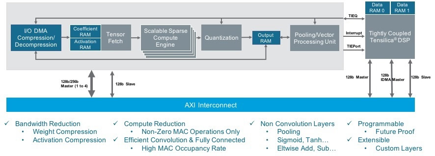 The DNA 100 processor architecture is shown in the block diagram above. The left-hand gray background block is a sparse compute engine with high MAC utilization. The block on the right is a tightly coupled Tensilica DSP that controls the flow of processing, and also future-proofs designs by providing programmability. You can think of these two blocks as the orchestra and the conductor.