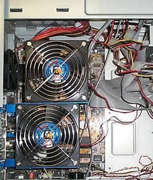 The first thing that we noticed when we saw the Card Cooler XT was "why others haven't thought of this earlier?". This cooling system consists of two 120mm fans rotating at high speed, screwed together within the blue frames that you can see in the picture below. Of course, you can unscrew the fans and use them as stand-alone for your PC case cooling needs.