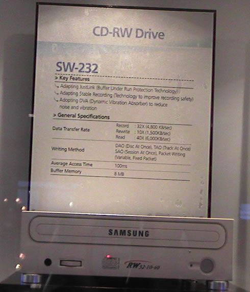 This is a 32x (Z-CLV) CD-RW drive that also supports 10x re-writing and 40x reading speeds. The buffer is 8MB and supports JustLink, "Stable Recording" to improve recording safety and "DVA" (Dynamic Vibration Absorber) to reduce noise and vibration. The access time is 100ms and supports : DAO, TAO, SAO, Multisession and Packet writing. As it seems Samsung drops off OAK Technology chipsets since now it uses "JustLink" as the main buffer underrun protection. Also no sign of Mt. Rainier support, at least for the SW-232.