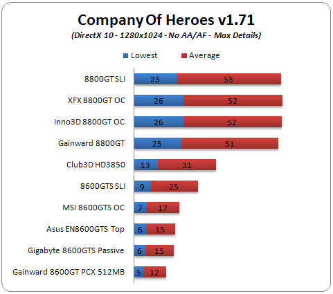 Passing on to DX10 and VISTA (32bit), we maxed all possible visual details for all tested games. This way we can identify if a graphics card can be used for high quality gaming and therefore greater gaming experience. Starting with Company Of Heroes, under D3D10 shaders, the game is really stunning. The Club3D performed better than the 8600GTS cards with 31FPS average performance.