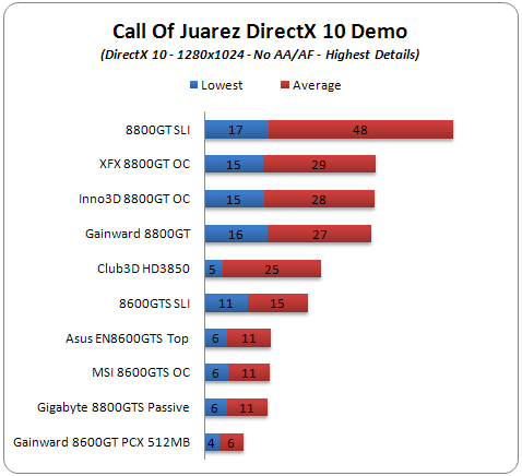Call Of Juarez is one of the first titles with full DX10 support. The Benchmark gives rather low frame rates with all cards. The Club3D had a good, if average performance with 25FPS. However, the lowest frame rate dropped down to 5 FPS.