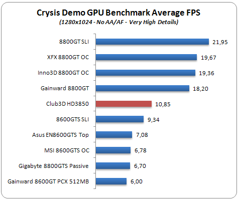 The Crysis Demo can work either under Windows XP or under VISTA and DX10. With DX10, users can enable Very High details for Crysis. This also implies a massive performance hit, since most cards performance drops 50% compared to what we get under the DX9 benchmarks with all details set to HIGH. The Club3D HD3850 again produced good performance, with 10.85FPS.