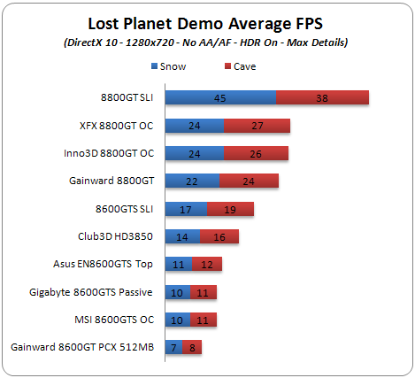 Lastly, Lost Planet another game that affects performance when all details are maxed out. This time,the 8600GTS SLI setup was faster than the Club3D HD3850.