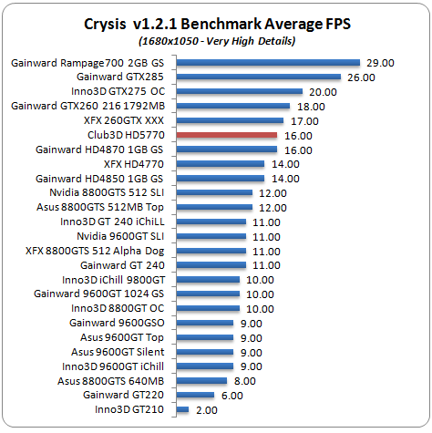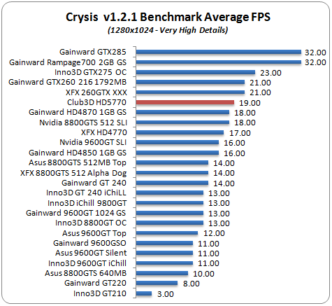 Let's move on with the very demanding "Crysis" game. The most other tested graphics cards offered acceptable frame rates at 1280x1024 (High quality settings). The Club3D HD5770 delivered 48FPS (average) with "High details" enabled (28FPS min & 64FPS max), which is the third best performance we have ever measured in our labs. The card was also 7.0 FPS faster than the HD4770: