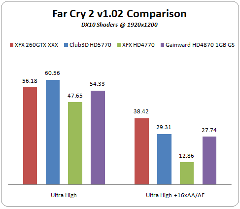 Enabling the "Very High Quality" settings has a big impact on the performance. This time the Club3D HD5770 gave 19FPS (14min & 30max), which again is higher than what we got from both the HD4770 and HD4870 graphics cards. The XFX 260GTX XXX seems to be somewhat faster and gave 21.0 FPS. Rising up resolution will not make sense for this game since you need to have an SLI/Crossfire system to get an adequate performance: