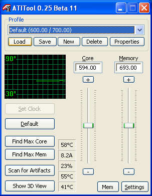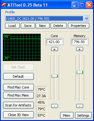 Firing up ATITool, we loaded the card's default speeds and started tweaking them.