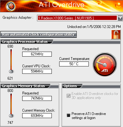 After letting the Automated clock configuration run for a little while, the overclocking frequencies selected were 620MHz for the GPU and 750MHz for the memory.