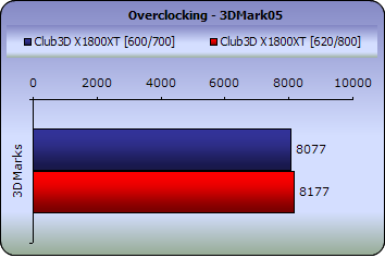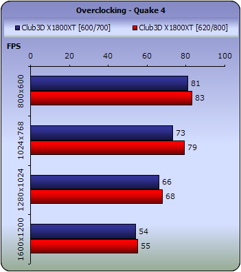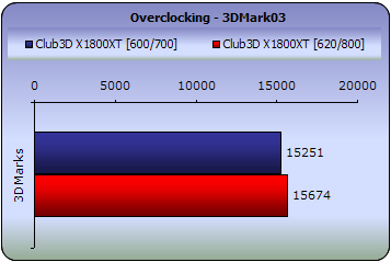 The stock clock speeds for the Club3D X1800XT were 600MHz for the core and 700MHz (1.4GHz effective) for the memory.