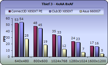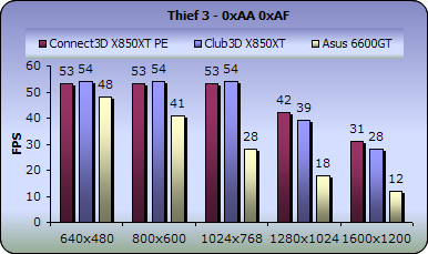 With the first three resolutions, both X850's are bound by the CPU to 54 frames per second. From that point on, the X850 XT from Club3D is just a breath away from the PE, while the 6600GT miserably fails to deliver even half the framerates of the other two cards.
