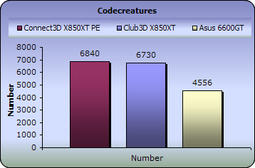 CodeCreatures is a synthetic 3D benchmark that is a good reference for VGA performance comparison. This is a high-end 3D benchmark that also requires DirectX 8 hardware, making a good tool for measuring the potential of DirectX 8 game performance.