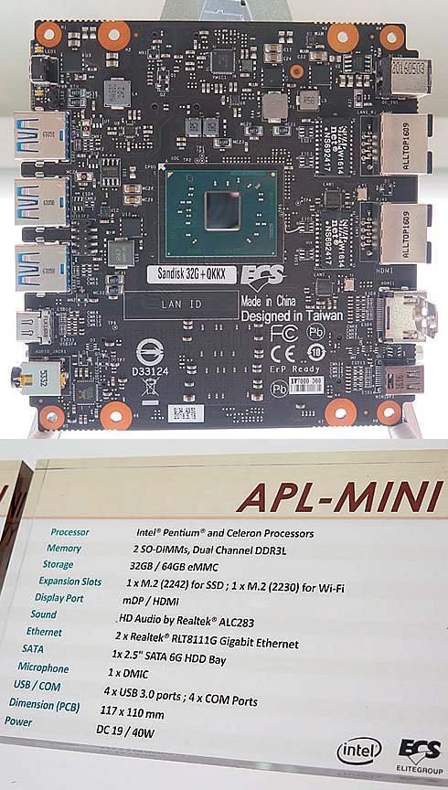 Taiwanese ECS is also showcasing the APL-MINI for the embedded market. The motherboard is based on the the Apollo Lake low-end Pentium / Celeron processors.