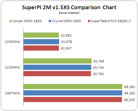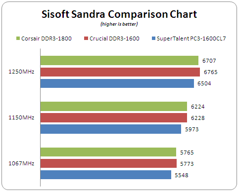 The Crucial DDR3-1600 seems to perform not only equal but better than Corsair DDR3-1800 in most Sisoft Sandra tests. Things seem to change in SuperPI, since SuperTalent had the lowest SuperPI 2M calculation time: