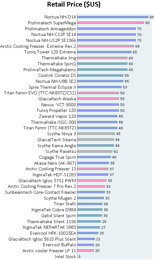 Price wise, the Scythe Rasetsu is a great deal for its performance, as well as the Scythe Ninja 3. The Arctic Cooling Freezer Extreme Rev2 could be a little bit cheaper, while the Thermaltake Jing is a little bit pricey but definitely worth's the extra spend as it comes with 2 fans. A Prolimatech's Super Mega would cost you a lot more but that's the deal when it comes with strong and efficient coolers.