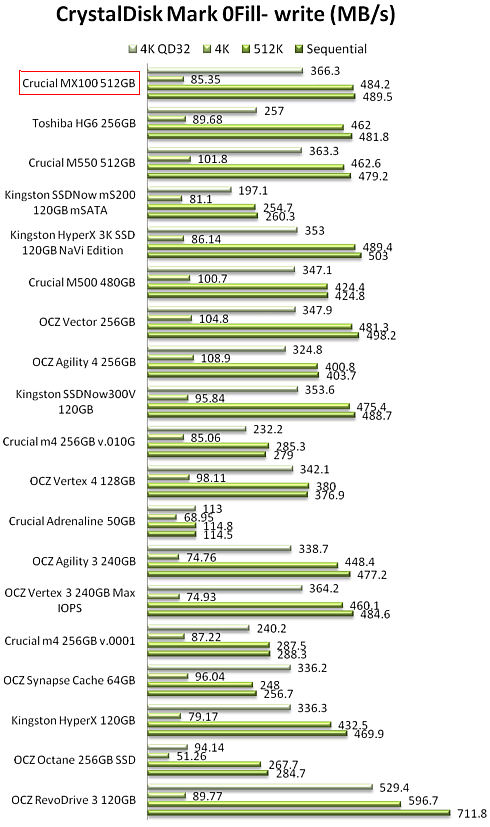 As you see below, the MX100 continues Crucial's tradition to offer SSDs that perform the same no matter if the stored/retrieved data is compressible or not: