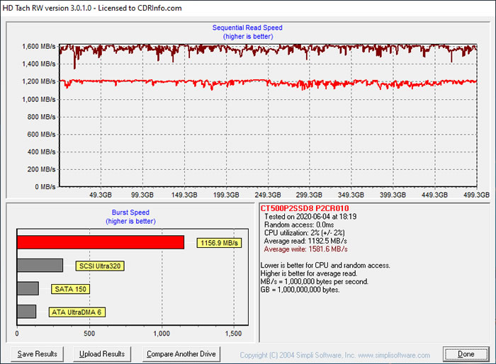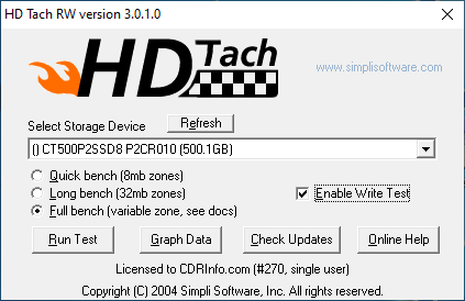 While HDTach is a rathe "old" software, it allows to examine the whole capacity of the drive. At this test it gives a rather strange result, indicating the writing speed above the reading speed. For sure writing speeds will "suffer" at an entry level product however the P2 seems to perform better than its specs.