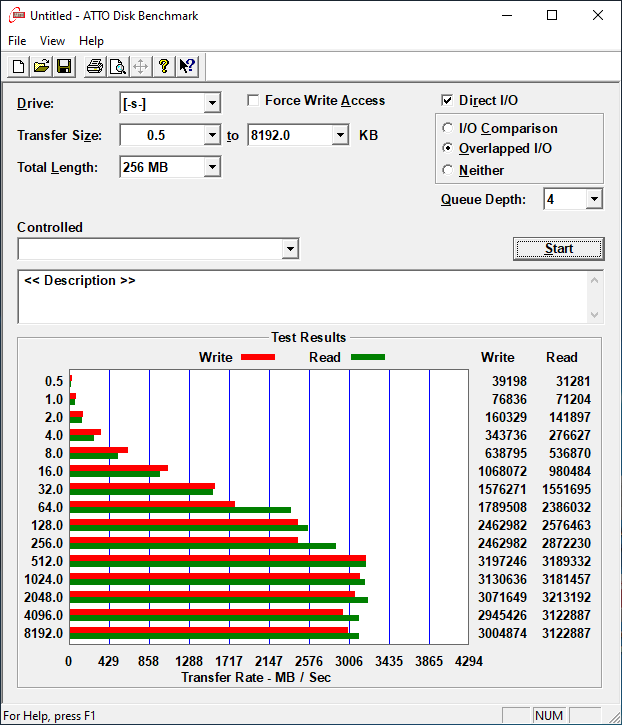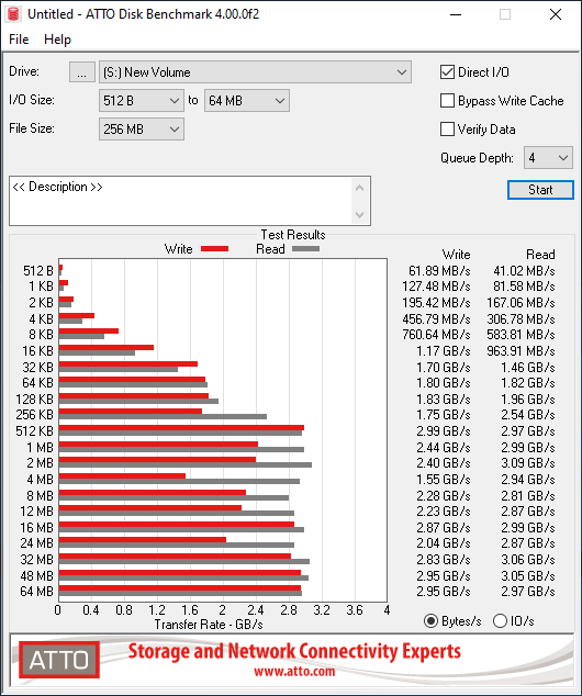 Next we used ATTO Disk Benchmark, at the v2.00 and 4.00 builds. Both software use some kind of caching but for sure the reported performance is very high for the P2 drive.