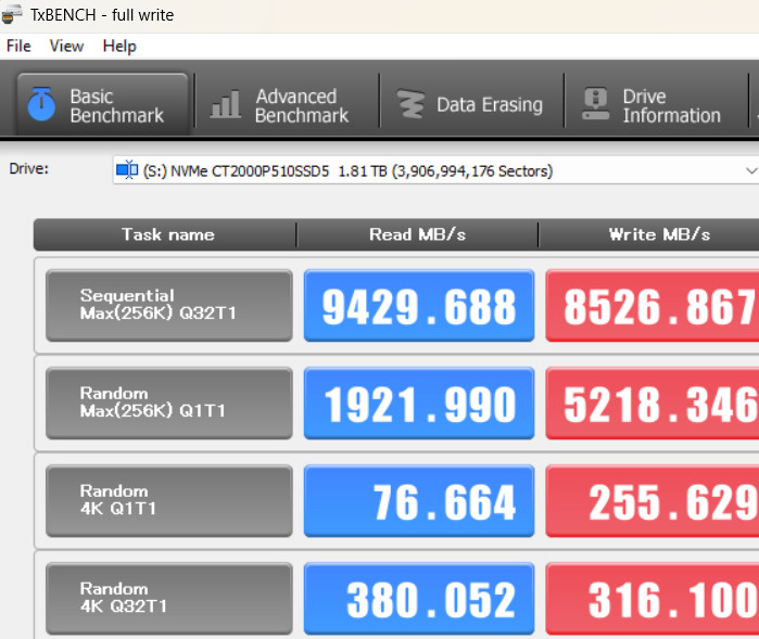More tests are available with the TxBENCH v0.96, which shows that the Crucial P510 NVME SSD can reach 9.43B/sec reading and 8.52GB/sec writing speeds.