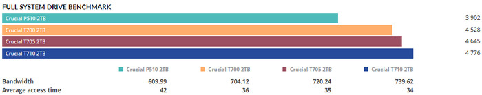 Lastly with the PCMark10 Full System drive benchmark, we can see some performance differences between the Crucial P510 series and the top-of-the-line P700-705-710 series, as was expected the Crucial P710 2TB is the highest performer with 4.776points, an average bandwitdh of 739.62MB/sec and 34ms average access time. The Crucial P510 is much lower with 609.99MB/sec and 42ms Average access time.