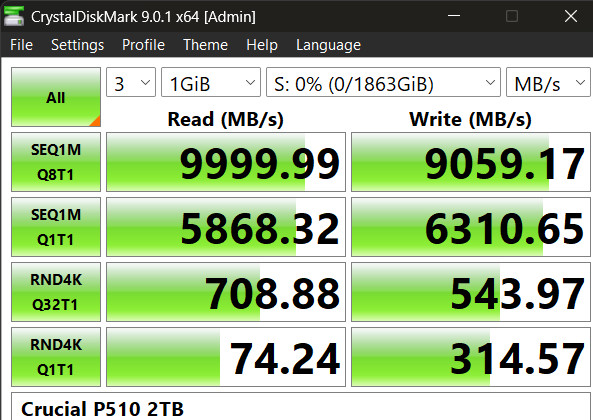 The latest CrystalDiskMark 9.0.1 promises up to 10.0GB/sec reading and 9.0GB/sec writing performance with sequential files that is according to the specs that Crucial advertises.