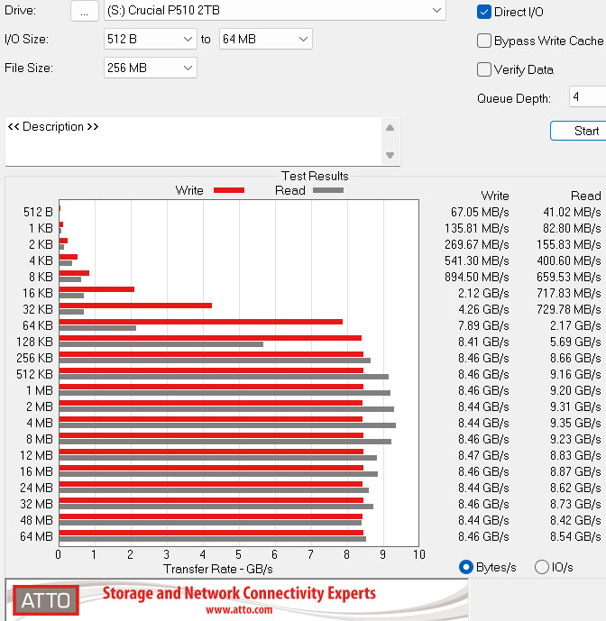 In the latest ATTO Disk Benchmark 4.01.0f1 version, we got good results, up to 8.54GB/sec reading and 8.46GB/sec writing performance.