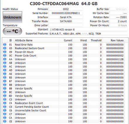 After installation, we run the CrystalDiskInfo utility software, which monitors the installed SDD. As you can see in the screen shot below, the C300 -CTFDDA064MAG SSD Ver.0002 supports the S.M.A.R.T, 48-bit LBA, APM, NCQ and TRIM features: