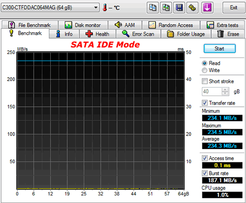 The HD Tune Pro software is also a utility we used to measure the drive's reading performance. The average sequential reading performance of the Crucial RealSSD C300 64GB was 234.3 MB/s for the IDE mode and a little bit higher for the AHCI mode (237.8 MB/s):