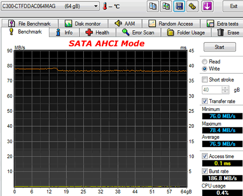 Let's see now the writing performance of the drive. Using the HD Tune Pro, we confirmed a 76.9MB/sec result for the sequential writing task for both IDE and AHCI modes: