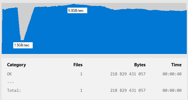Performing the same test with a single 218GB file, gave us, more or less similar results. The single file was written without any issues and performance was very good, up to 6.0GB/sec, with a small drop in writing speed.