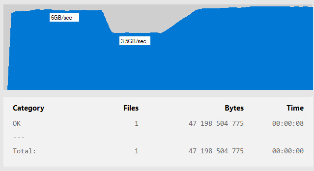 The latest version of CrystalDiskMark reports around 12.3GB/sec reading and 11.8GB/sec reading at sequential files.