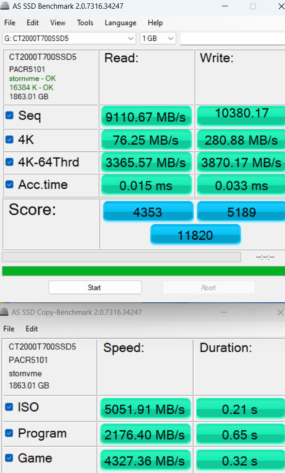 Passing to the AS SSD Benchmark, we got a very high score with 11820 points.
