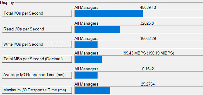 At the I/O Meter test, the drive didn't show great performance, got only 48689 points, and had a very high I/O response, which was confirmed even after running three times the same test. Perhaps with Intel-based systems, performance could be better.