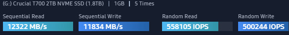 FutureMark 3DMark also includes a storage benchmark, where the Crucial T700 got around 4352 score, which is rated at the middle category, again we see high access times, at least with our current motherboard/processor setup.