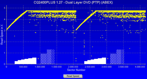 The CDVD Benchmark showed that the drive cannot handle heavily scratched DVD-ROM media. The drive stopped reading by the end of the first layer, and the test was terminated. The result was expected, since the CyQ've 2400Plus had previously failed to successfully finish the single layer scratched DVD-ROM reading test.