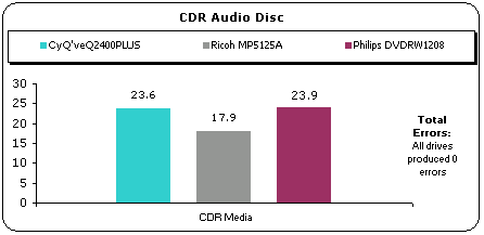 In this test we examine the speed of the DAE of the drives. CyQ've 2400Plus ripped the audio files to the hard disk 22.5X average speed. The Ricoh and Philips drives are approximately 1X faster.
