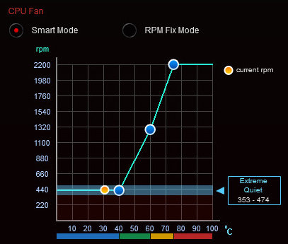 We set the CPU fan speeds at "Smart Mode" with the Asus Xpert4 software. The case fans were also set at SmartFan mode with the option for Auto Fan Stop at low loads down to 0% for the two front fans and auto for the back case fan.