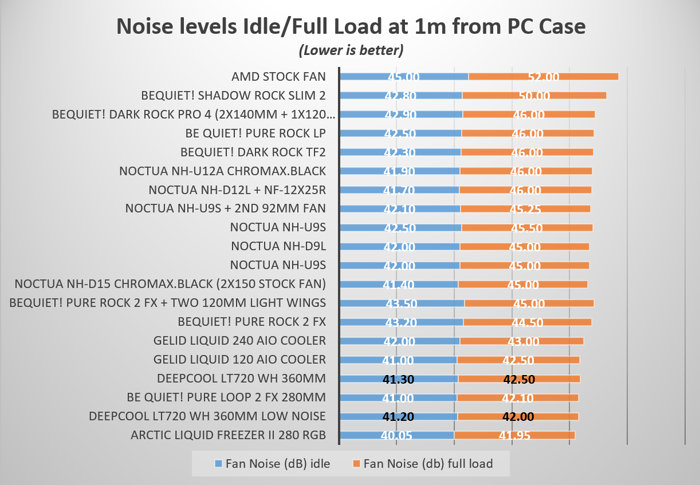 Placing the miniDSP UMIK-1 microphone around 1m from the closed case, we were pleased to get very low overall case+cpu cooler noise. The DeepCool LT720WH 360mm produces very low noise either idle or under the above full load. The low-noise adapters do work and lower around 0.5dB the overall noise at the distance of 1m.