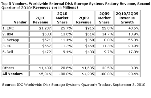 Worldwide external disk storage systems factory revenues posted year-over-year growth of 20.4%, totaling just over $5.0 billion, in the second quarter of 2010 (2Q10), according to the International Data Corporation (IDC) Worldwide Quarterly Disk Storage Systems Tracker.