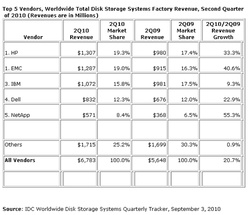 In the total worldwide disk storage systems market, HP and EMC finished in a statistical tie* for the top position, in terms of market share, with HP at 19.3% market share and EMC at 19.0% market share.