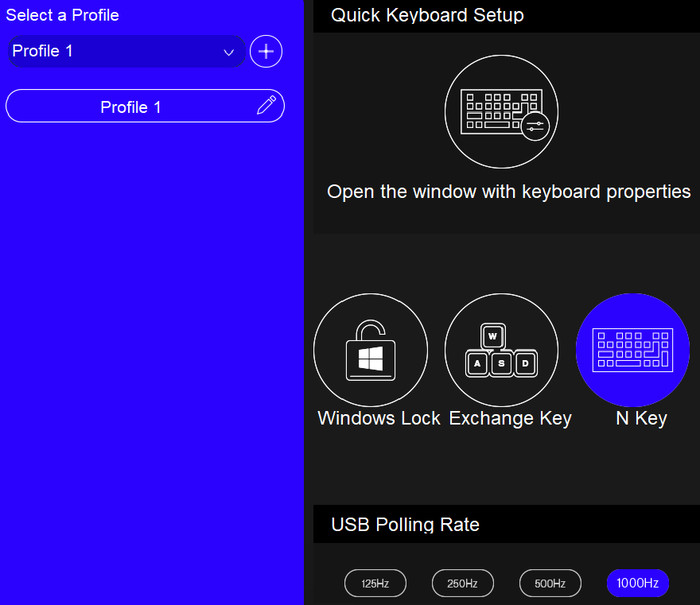 While at the other tab, users can make new profiles and also set the USB polling rate (125Hz, 250Hz, 500Hz, or 1000Hz (default)).